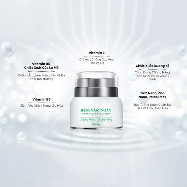 3 sản phẩm tương ứng với 3 bước làm mờ vết thâm nám, chăm sóc, nuôi dưỡng làn da không may bị nám gồm: Kem nám ngày, Serum tái tạo và Kem nám đêm.