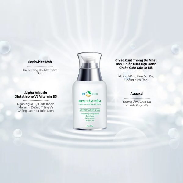 Kem nám đêm BioCos kết hợp giữa tinh chất thiên nhiên và công nghệ Biovector hiện đại, vượt trội, ức chế hình thành melanin và gốc nám hiệu quả, giúp dưỡng ẩm, làm dịu và tái tạo da.