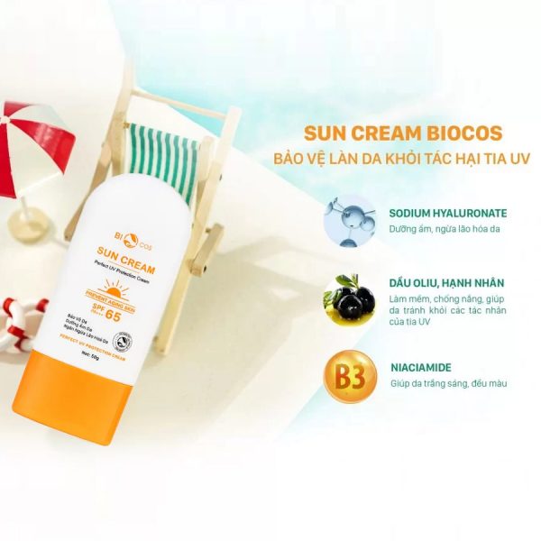 – Thành phần Sun Cream BioCos có sự kết hợp giữa chất chống nắng vật lý và chất chống nắng hóa học mang đến khả năng chống nắng và bảo vệ da hoàn hảo khỏi tác hại của tia UV.